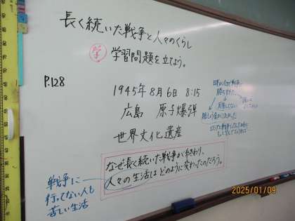社会では戦争について学習をします。1学期に平和のことについて学び,修学旅行では広島へ行き、戦争の恐ろしさや平和の幸せさを知りました。今回の学習でさらに学びを深められるといいですね。
