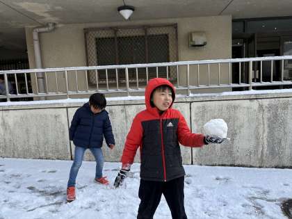 待ちに待った中間休み、寒くても雪遊びがしたい!という子達は、我先にと運動場に飛び出しました。雪玉を大きくしたり、友達と投げ合ったり、先生にぶつけてみたり。元気いっぱいに遊びました。