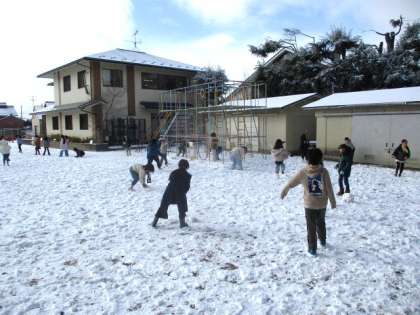 朝は屋根にうっすらと雪。運動場も線が書ける程度の雪でした。少したまっているところの雪を大事に集めて雪玉を作って遊んでいました。