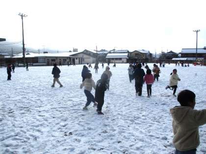 1時間目の半ばくらいから子ども達は窓の外が気になる様子。岩倉も一気に雪化粧。数十年前の岩倉なら当たり前の光景だったのですが、今はめったにない状態。中間休みが待ち遠しい雰囲気が教室に満ちてきています。早めの中間休みで、外に飛び出す3年生。雪玉を作って投げ合ったり、雪だるまを作ったり、冬の遊びを楽しみました。