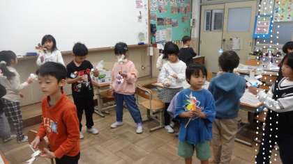 風車をつくって,遊びました。