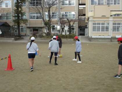 体育ではサッカーの学習が始まりました。状況に応じたパスの仕方を学びました。ゲームではチームでパスを繋いで頑張りました。友達のすねを蹴らないように気を付けてね。