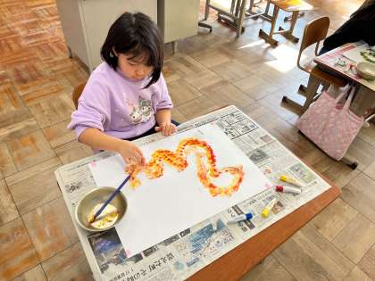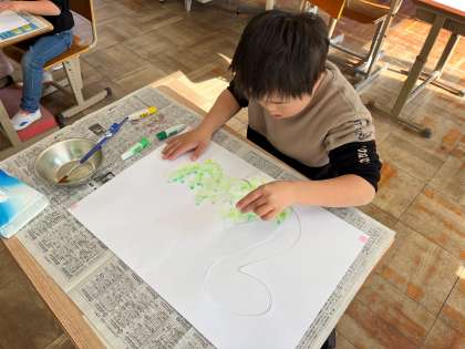 図工科の学習で、スポンジを使って色を付ける活動をしました。それぞれに好きな色を3色選び、少し水を含ませます。今回はへび年ということで、へびを型取った画用紙を丁寧に塗りました。