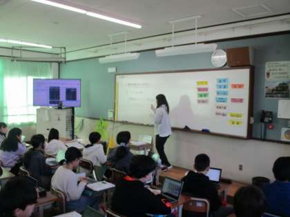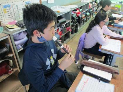 初めはリコーダーの練習。そして「旅立ちの日に」滝廉太郎の「花」の学習をしました。心地よい歌声が教室に響いています。