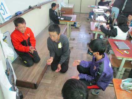 明日は茶道体験です。明日に向けて茶道の礼儀、作法について確認しました。うまくできるかな?