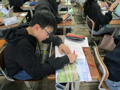 ポップ作りをしています。自分が感じたことを表現する。感じ取ったことを楽譜に書き込んでいく。友達に曲の魅力をどうすれば伝わるかな?