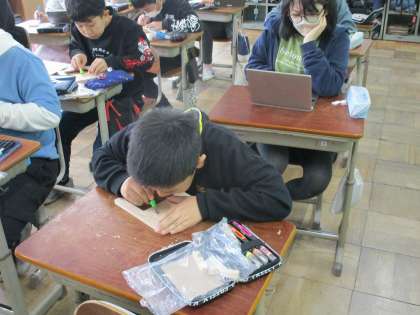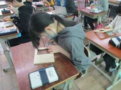 写真立ても少しずつ出来上がってきました。丸刀や小丸刀を使って浮彫をしています。もう少しで色をつけ始めるかな?