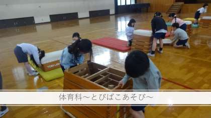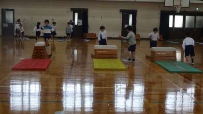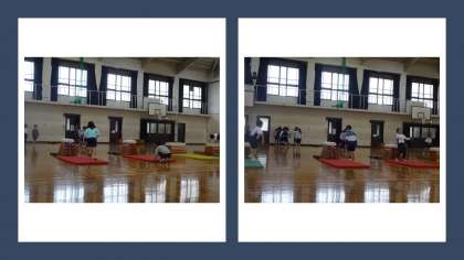 挑戦しています。跳び箱も安全に力を合わせて持っています。