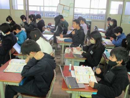 聞き取りながら単語を書いています。中学校へ向けて頑張っています。少しずつ。