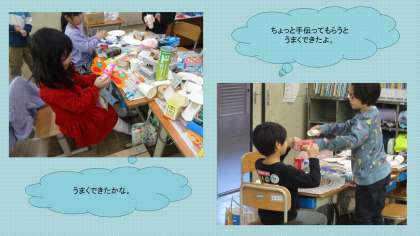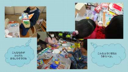 図画工作科では、ビューンと飛んできたり、スルスルっと降りてきたりしたら面白いものを材料の形から想像することや、材料を組み合して試すことを楽しみました。アイデアを話し合い「それいいね。」「おもしろいね。」とわくわくしながら作り始めました。どんな作品ができるか楽しみです。