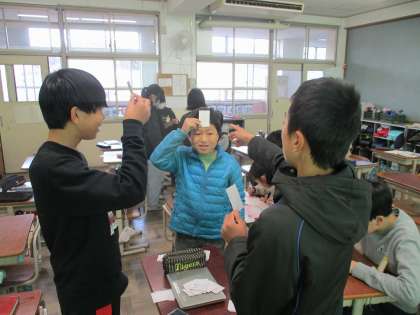 なんやら、おでこにトランプを当てて、友達のトランプの数に注目していますね。これはインディアンポーカーというゲームです。面白い遊びを知っていますね。
