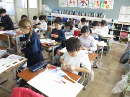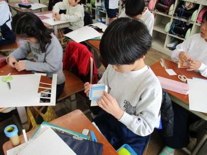 算数科「はこの形」の学習で、工作用紙を使ってはこづくりを行いました。どんな形の面がいくつあるのかを考え、工作用紙に面の形をかきて、切り取った面をテープでつなぎ合わせました。どの面をつないだらうまく箱をつくることができるかよく考えて学習を行うことができました。