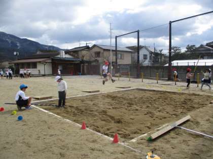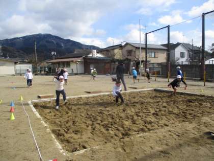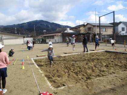 うまく踏切板に利き足を持っていけたら、気持ちよく跳べます。が、助走が遅いと距離は伸びません。助走を速くすると踏み切る足が違ってくる。その狭間で苦労しているので、リズムをつけて走れるよう「声を出して走ろう」という指示がありました。すると、速い助走で気持ちよく跳べ、距離も伸び笑顔が弾けます。これからどのくらい伸びていくでしょう。次は、上半身の動きかな。