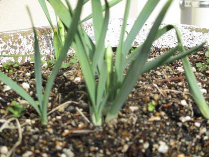 スイセンにもようやく花芽が出始めてきました。給食室南側の一番陽当たりがよい花壇や、池の横の花壇などで芽吹いています。これからこの花芽が伸びていき、白と黄色の花を咲かせることでしょう。