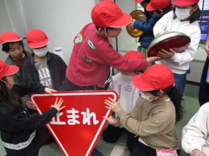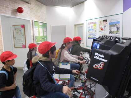 「京都府警察広報センター」では、ビデオ視聴・クイズによる学習の後、交通管制センターや通信指令センターを上部から見せていただきました。通報があった時にどのような動きをするのか、どのような機材があるのかなど、子どもたちは細部まで目を凝らして見ていました。本物の標識や信号機にも触れさせていただき、その大きさを実感していました。この後、道路を歩いている時、「あんなに大きかったんや。」「大きさが違うものもあるな。」などと言っていました。また、館内の展示コーナーにある自転車シミュレーターが順番待ちするほどの大人気。やってみると“飛び出してくる人”や“自動車に衝突する子”が多くいました。現実にそのような事故が多発しているので、その通りに設定してあるということでした。自転車に乗る時だけでなく、徒歩の時にも注意が必要であることを体感したようです。交通安全をいっそう心掛けてほしいものです。
