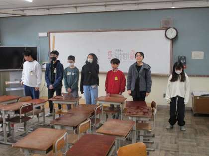 6年生を送る会で言葉を話してくれる子どもの練習風景です。全校に思いが伝わるようにはきはきと話しています。思いが伝わるように。