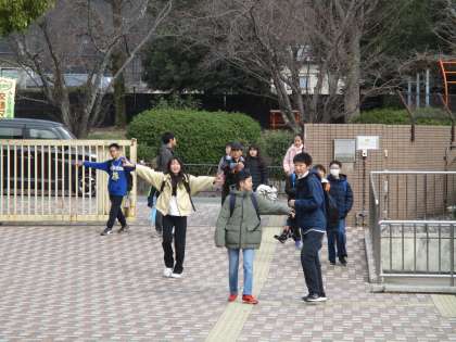 活動を終えて学校へ帰ってきました。学校に到着したとたん手を挙げる子どもたち。自分たちで市内を行動する。本当に成長しました。よく頑張りました。あっぱれ!!!