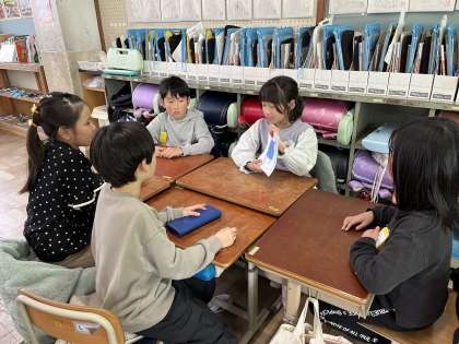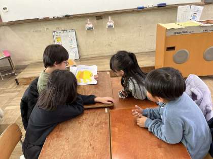 英語活動「絵本をしょうかいしよう」では、絵本「Brown bear」で、色や生き物の英語表現に慣れ親しんできました。そして、今度はオリジナルの絵本を作って発表するために、グループで練習しています!