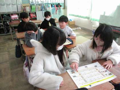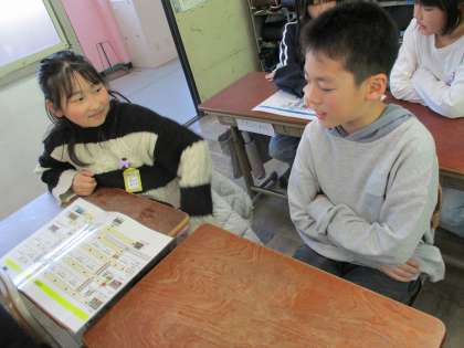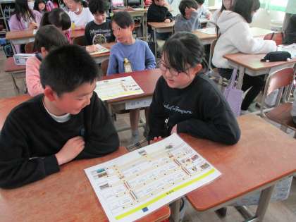明日は、ずっと延期になっていた6年生に明徳小学校のお気に入りの場所について紹介する日です。今日は、まず、違うクラスの4年生の友達に紹介しました。道案内をしたり、好きな理由を伝えたりしていました。久々の英語での道案内でしたが、友達とアドバイスし合いながら、明日の本番に向けて、確認をしていました。