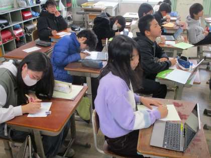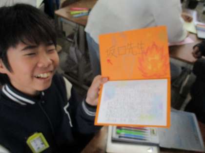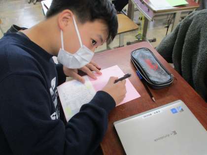 教職員や地域の方々に感謝の手紙を書いています。今までお世話になった感謝の気持ちを手紙に込めています。真心を込めて。