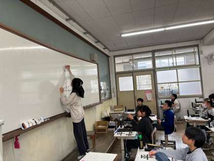 今日は今年度最後の書写の授業がありました。今までに学習してきたことを踏まえて、最初に気をつけるポイントを確認しました。みんなで確認することで、自分一人では気が付けなかったかしょにも注意を払って書くことができました。