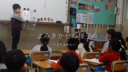 3年生が、国語の学習で読み聞かせを朝の帯時間に来てくれました。楽しい本を選んでくれたので1年生は、身を乗り出して集中して聞いていました。読み方もとても工夫されていたので面白かったです。1年生から読み聞かせの感想も伝えることができました。本の楽しさを共に味わえた時間でした。3年生ありがとう。