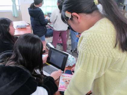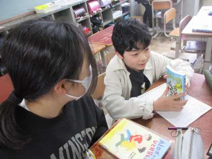 ビブリオバトルにむけて休み時間にも練習している人がいました。お互いに聞き合ってアドバイスをして本番にむけて準備していました。