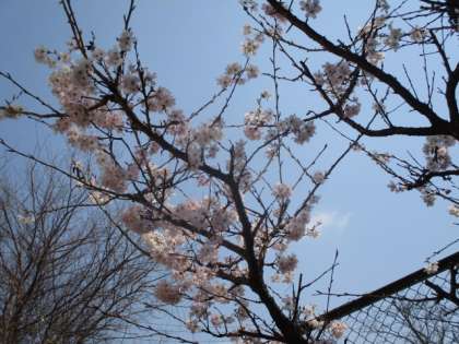 「桜が咲きましたね。」「どこで?」「校門横の桜…。」向かいの公園のソメイヨシノもまだつぼみがふくらんだばかり。早とちりな樹でもあるのかいな、と見に行くと、何と低い桜の樹が満開です。外からだとフェンス越しに少し見づらいのですが、確かに桜です。ソメイヨシノではない桜だろうかと調べてみると、日本に分布している桜のうち80%以上がソメイヨシノだといわれていますが、交配してできた変種や観賞用に開発された改良品種を合わせると、その数は600種類を超えるといわれています。その中にソメイヨシノよりも早く咲く品種としては、カワヅザクラやカンザクラなどの名前をよく耳にします。写真と見比べると、ヒガンザクラのような気もします。違いがよくわかりませんので、教えていただけるとありがたいです。