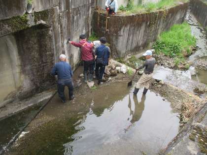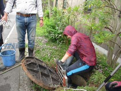 川から水をたくさん得られるよう、マンホールに入って掃除をしたり、川から水を得やすいように整備をしたりしました。