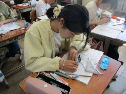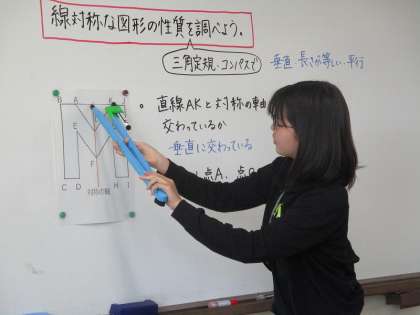 線対称な図形の性質を調べました。三角定規やコンパスを使って、対応する2つの点を結ぶ直線が対称の軸と垂直に交わっていることや、対応する点からの長さが等しいことを見つけました。