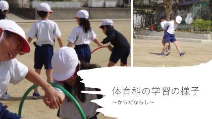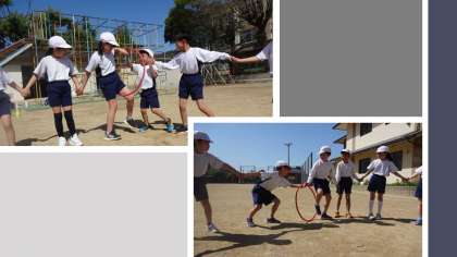 からだならしの学習をしました。みんなで協力しながらフラフープをくぐったり、相手のことを考えてボールを落とさないように運んだりしました。手をつないで声を上げて楽しく体慣らしの学習ができました。
