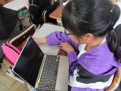 学校の中の好きな風景を切り取って絵を描いています。遠近法やバランスを意識して、写真と見比べながら真剣にかいていました。