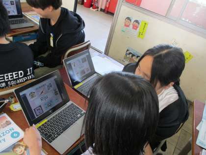 これまで学習したフレーズを使って、自己紹介をレベルアップさせています。I like〜.ばかりになるのではなく、I want to go to〜 や My favorite〜の表現を使っている人も増えています。5年生との交流にむけて友達と何度も練習しています。