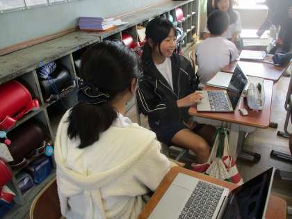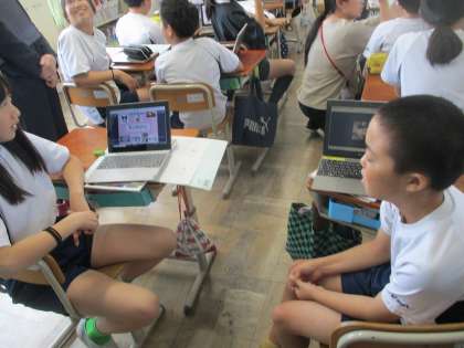 5年生との交流にむけて友達と一緒にレベルアップするために試行錯誤しています。友達の困りを一緒に考えて、友達の自己紹介が5年生に伝わりやすいように工夫しています。ハイレベルな英語を使うのではなく、相手が5年生ということを意識してジェスチャーなども取り入れて練習しています。