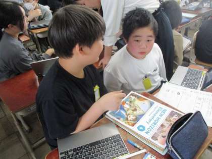 来週の5年生との交流にむけて友達と協力しながら自己紹介を練習しています。今日は相手が5年生であることを意識して、どんな工夫をするべきか考えました。5年生には伝わりづらい表現があるからジェスチャーを交えたり、協調してゆっくり話したりと工夫をしていました。たくさんの人が見ている中でも一生懸命話すことができましたね。
