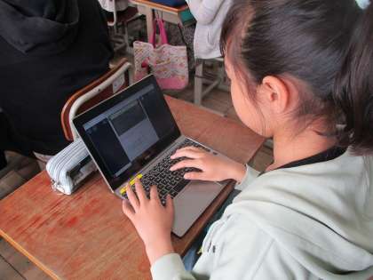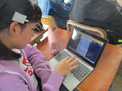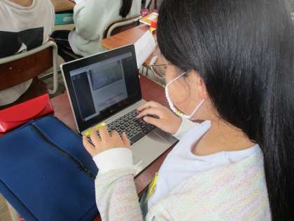 学校の風景を切り取った絵が完成し、ふりかえりを書きました。本格的な水彩画に挑戦して、遠近法や色の濃淡を工夫しました。全体のバランスや水の量の調節に苦戦しながらも一生懸命描いたことがふりかえりからも伝わってきます。