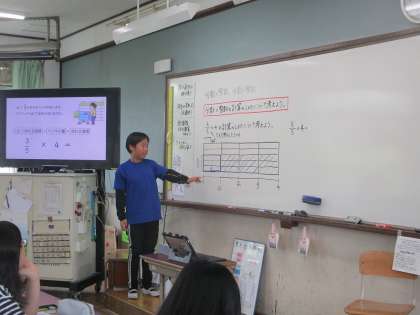 分数×整数の計算の仕方を考えました。分数に苦手意識をもっている人もいましたが、分数ってそもそもどんな数なのかを確認しながら丁寧に取り組んでいます。図に表して、計算の方法をペアで確認しました。
