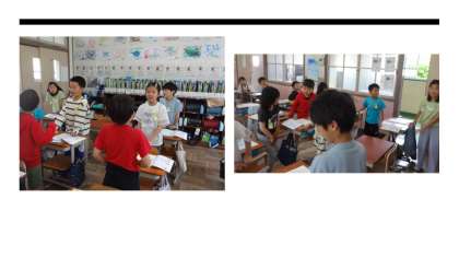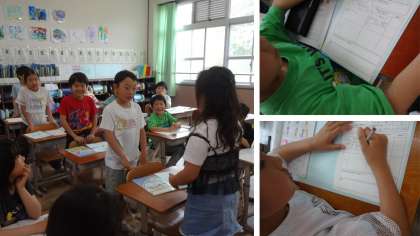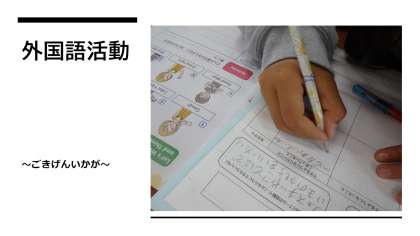外国語活動では、表情やジェスチャーを工夫しながら「ごきげんいかが?」と尋ねたり、答えたりする学習をしています。気持ちを表す言葉も、いろいろ知って使える英語が増えたのでどんどん使って活動しました。英語で反応したりジェスチャーをしたりしてやり取りを楽しんでいました。