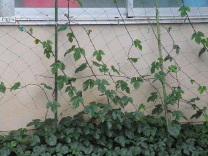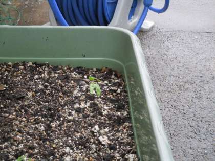 そして、こちらも外来種の西洋アサガオ。北校舎東入り口横のお手洗いのコンクリートの隙間から葉を伸ばしています。今年も勢いよく葉の数を増やし、2階を目指して伸びています。花が咲くのは晩夏のころから。よくこんな隙間から大きくなるものだと、毎年感心させられます。と、すぐ横の空いていたプランターから、西洋アサガオか日本のアサガオかまだ不明な子葉が顔を出しました。1年生のアサガオの種まきも終わりました。誰か芽に気付く子はいるでしょうか。