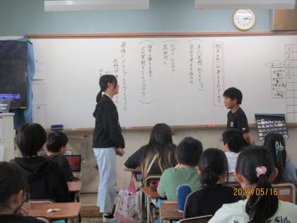相手の思いを引き出すインタビューをするために、どんなことに気を付けるべきか考えました。相手の返答からさらに質問を考えたり、相手の返答に共感したりできるように、友達同士で練習しました。来週から学校内の先生たちにインタビューです。頑張っていろんな情報を引き出してください!
