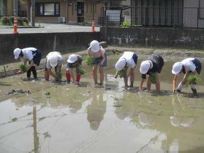 泥にしっかりと苗を植えるのにはコツがいるようで、はじめは戸惑っていた様子の子どもたちも、何度か植えると慣れた様子で植えられていました。