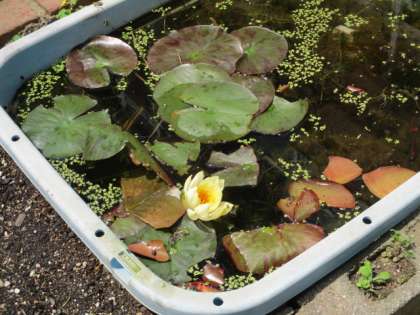 スイレンも咲きました。たまり水で放任しているのですが、毎年咲いてくれます。昨年も書いたのですが、スイレンの葉には切れ込みがあり、ハスの葉にはありません。その葉の隙間から時折メダカが顔をのぞかせます。1年生は見つけてくれるかな。
