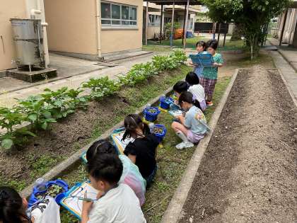 今日は、そんな双葉の様子をじっくりと見てもらおうと、探検ボードを持って観察に出かけました。色や形、大きさだけでなく、匂いや手触りについても注目して観察を行いました。「茎の色が途中から違うね」「触ったらぼこぼこしていたよ」など、思い思いに感想を伝えてくれました。