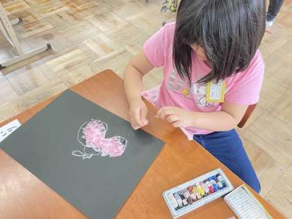 お花紙を使って作品作りをしました。お花紙は薄くて柔らかいのですぐにちぎることができます。その性質を生かして、果物のちぎり絵を行いました。細かくちぎったり、大きくちぎったりとちぎり方で大きく個人差があり面白いなと感じました。ボンド水を筆を使って塗りながら、画用紙にペタペタと貼っていきました。パッと見ても何なのかわからない作品もあるかもしれません。その時はゆっくりと想像しながら鑑賞していただければと思います。