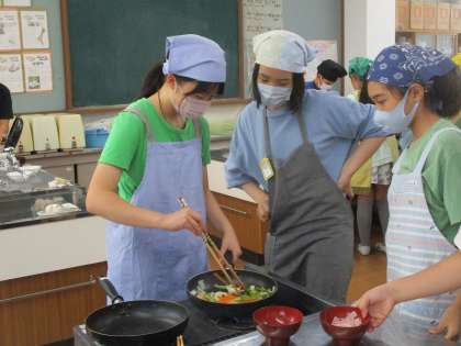 スクランブルエッグといろどりいためを調理実習で作りました。グループで協力して、役割分担しながら作りました。みんなで作った料理はおいしかったかな?