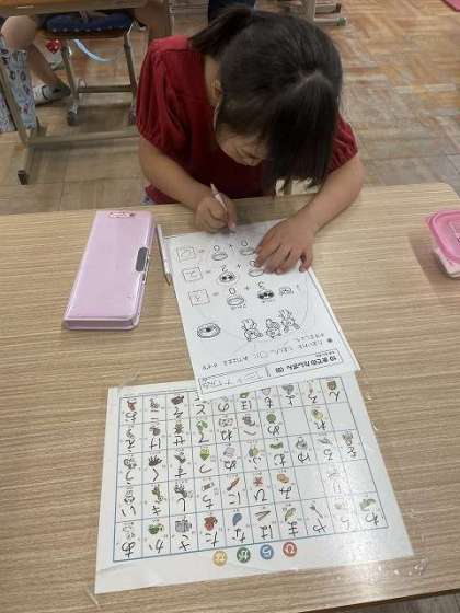 数の合成の学習として、「玉入れゲーム」を行いました。かごの中に3つのボールを投げ入れ、いくつ入ったか競いました。1回目、2回目、3回目と対決を重ね、「合わせて」という数の合成を表す言葉を何度も言いながら、理解を深めていきました。また、勝ち負けを取り入れることで、負けた時の気持ちの折合いのつけ方を学習しています。玉入れゲームの後は個別の学習進度にあったプリントに取り組みました。