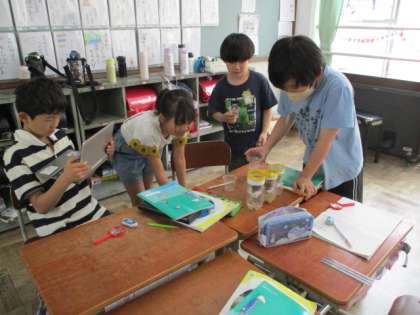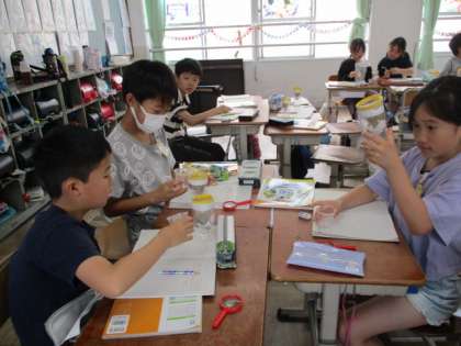 今回は教室でモデル実験。粒の大きさの異なる砂や土を上のペットボトルに入れ、そこに水を注ぎ、下のペットボトルに注いだ水が出てくる様子を観察します。さっそく「速い!」や「きれいになっている。」という声が教室に響きました。理科の実験はこういうところがおもしろいのですね。みんな目を見張っています。さっそく社会科で学習した浄水場の機械と結びつけて、「これが浄化槽と同じ役目をしているか。」という子もいました。この発想がうれしいです。