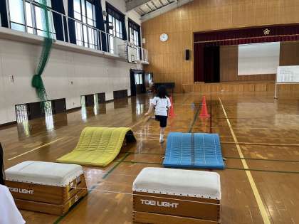 忍者修行を終えたみんな。今回はぴょんぴょん特訓でした。跳び箱を飛び越えるゾーン、輪っかを飛び越えるゾーン、ゴム飛びゾーンと様々なステージを用意しました。子どもたちは自分から何度もチャレンジしていくかっこいい姿を見せてくれました。暑い中でしたが、いい汗を流したようで、体育終わりの顔はみんなすがすがしい顔をしていました。