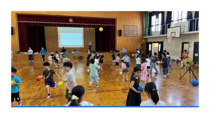 京都の「わらべうた」を教わりました。「丸竹夷」「京大仏っつあん」「なべなべしそこぬけ」「いちもんめのいすけさん」を歌ったり、歌いながら遊んだりしました。はじめて経験した子どもたちもたくさんいたので、とても新鮮で面白かったようです。いろいろな「わらべうた」の楽しみ方を知ってよい機会になりました。