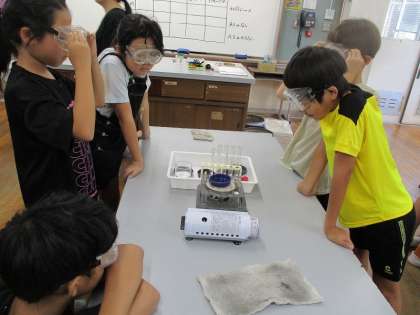 理科の学習では5つの水溶液を見分けるために、加熱して蒸発させる実験を行いました。見た目の違いやにおいの違いはほとんどなかったのですが、蒸発させてみると蒸発皿になにも残らない水溶液と残る水溶液がありました。蒸発する反応に子どもたちはとてもおどろいていました。火を使っての実験でしたが、きまりを守って安全に実験できました。